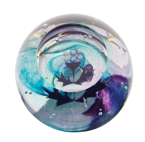Admire the intricate detail of the tiny thistle flower captured in this exquisite miniature paperweight. Set atop a vibrant swirling backdrop of purple and blue, this petite Scottish thistle is a marvel of hot glass sculpting. Made by Caithness glass artisans, this wee thistle makes a special gift or charming accent piece.